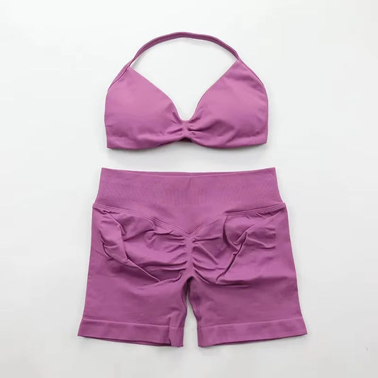 Ruched Seamless Yoga Set Women Sportswear Impact Gym Shorts Strappy Sports Bra 2 Piece Set Halter Workout Clothes Fitness Suit
